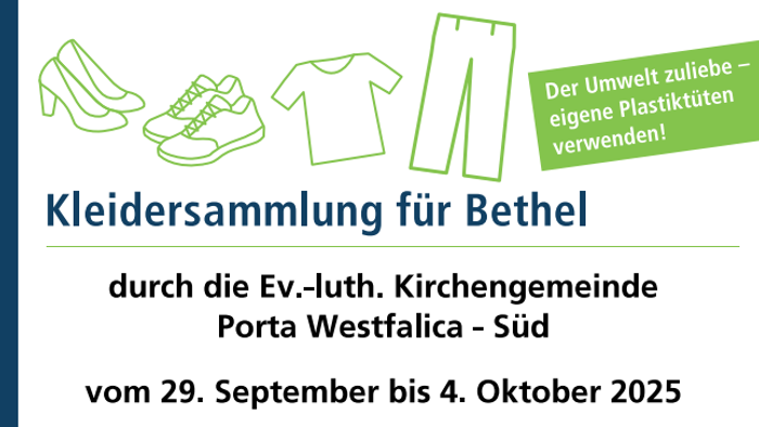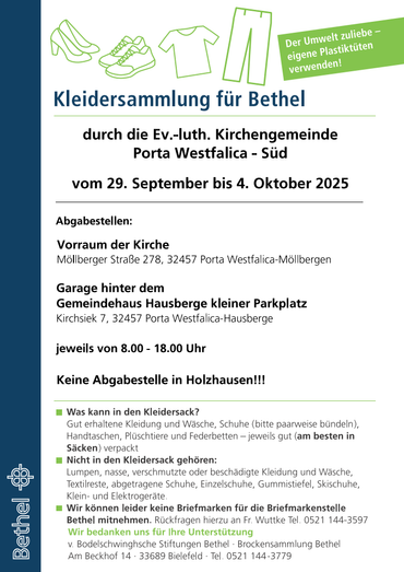 Die diesjährige Kleidersammlung für Bethel findet vom 29. September bis 4. Oktober 2025 statt. Abgabestellen sind in diesem Jahr die Garage hinter dem Gemeindehaus Hausberge (kleiner Parkplatz, Kirchsiek 7) und der Vorraum der Kirche in Möllbergen (Möllberger Straße 278) jeweils von 8.00 Uhr bis 18.00 Uhr. Die Abgabestelle in Holzhausen entfällt!